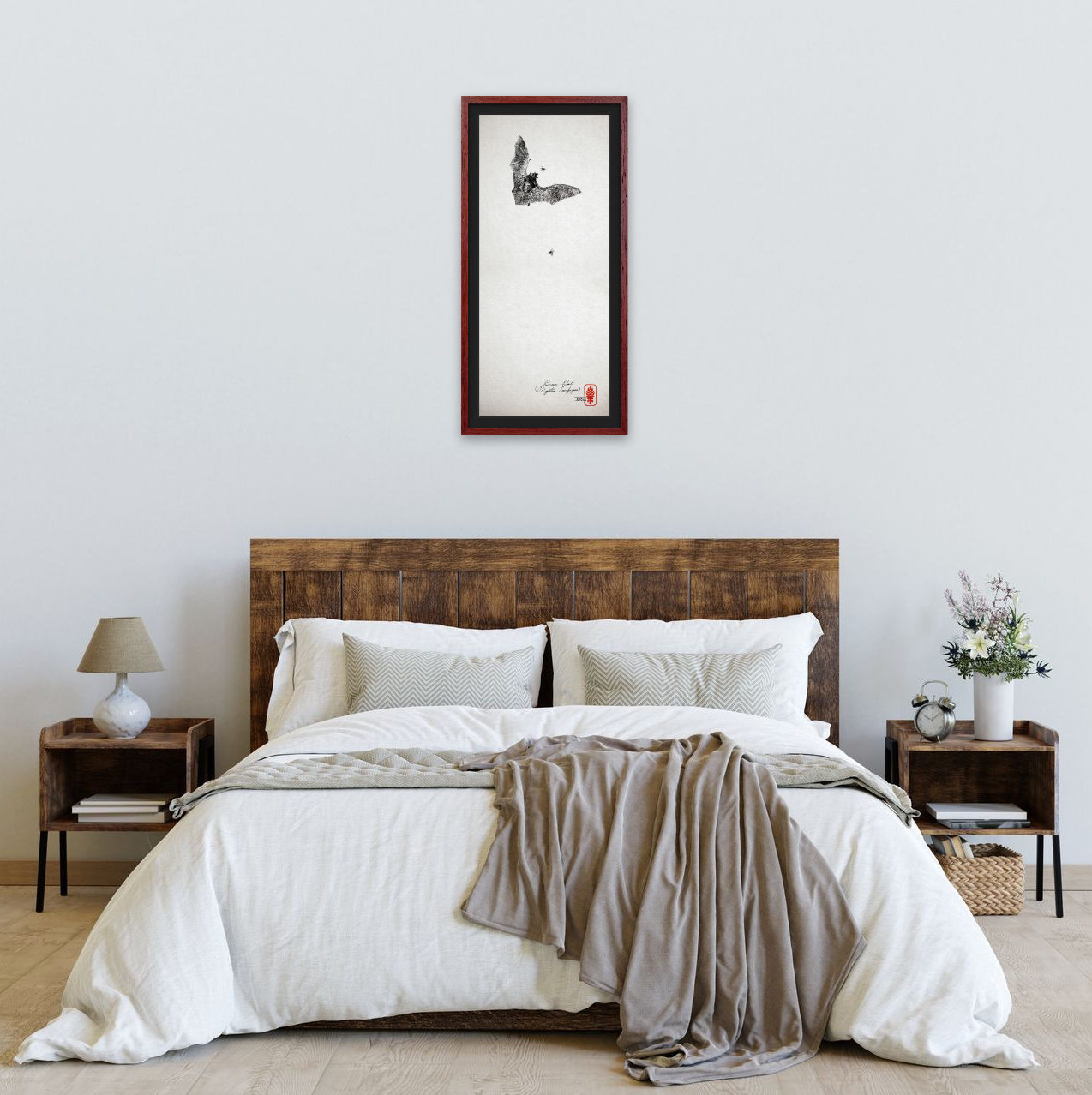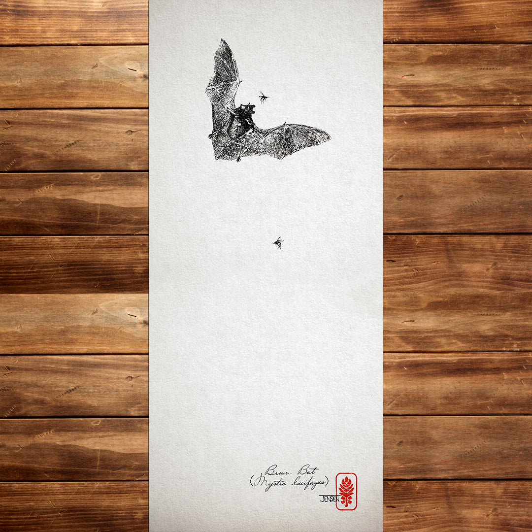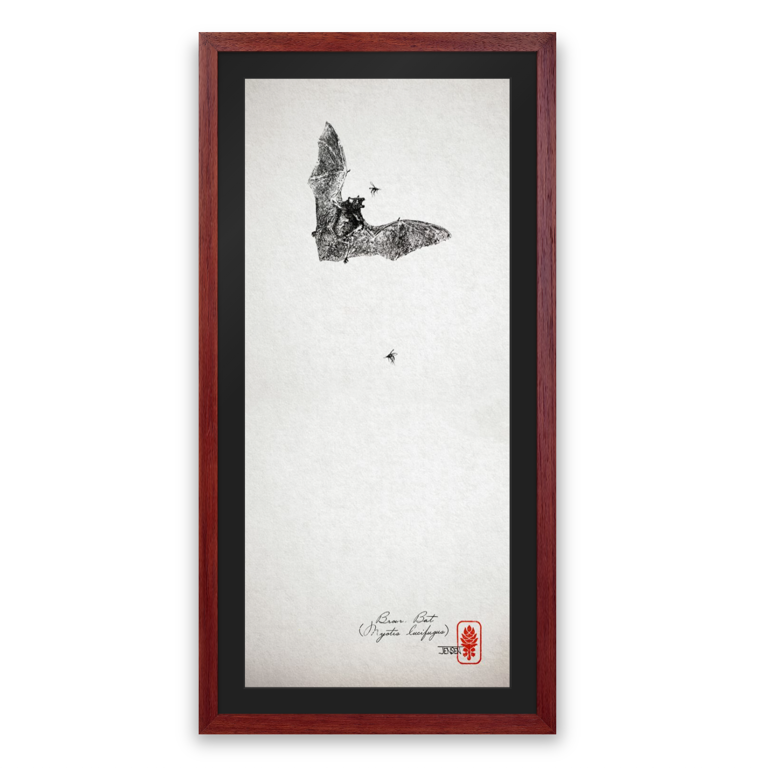 A fan favorite! This unique gyotaku piece uses negative space to capture a moment of action as a feeding bat zeros in on her luckless dinner.