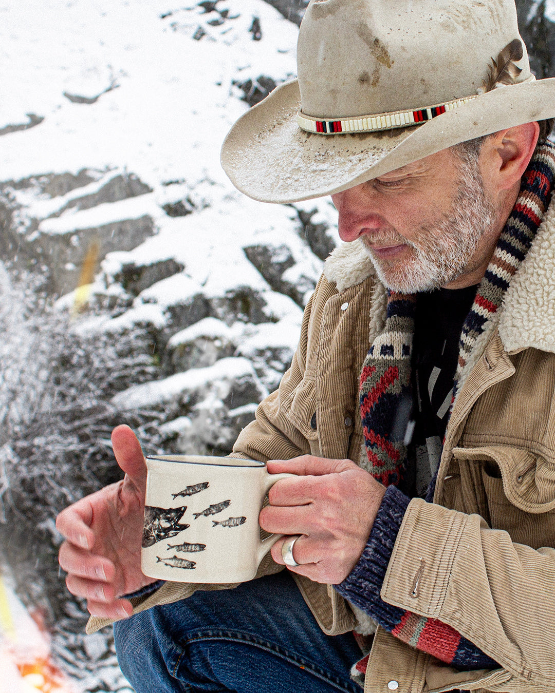 12-oz. custom gyotaku mug, perfect for coffee in the morning or whiskey in the evening. Kiln-fired at high temp and safe for microwave, dishwasher or a scrub in the stream. Features custom gyotaku graphic of squawfish chasing steelhead par.