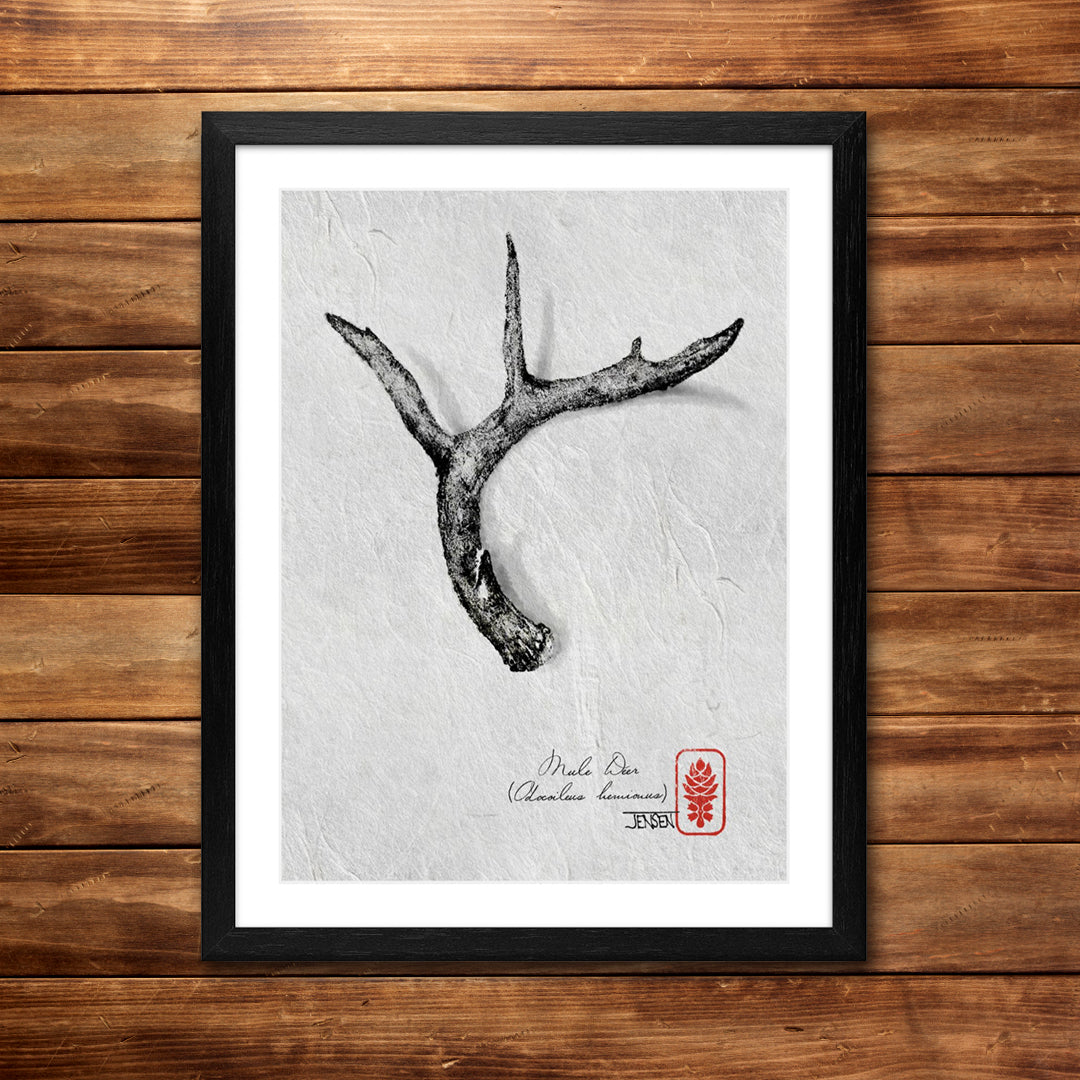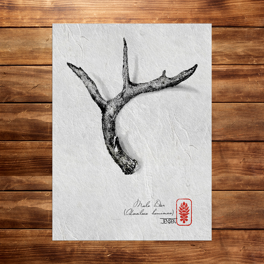 The same printing method used for fish was done here on this beautiful mule deer shed. Kakutaku - "kaku" horn + "taku" print. Reproduction from sumi ink on handmade mulberry fibre.
