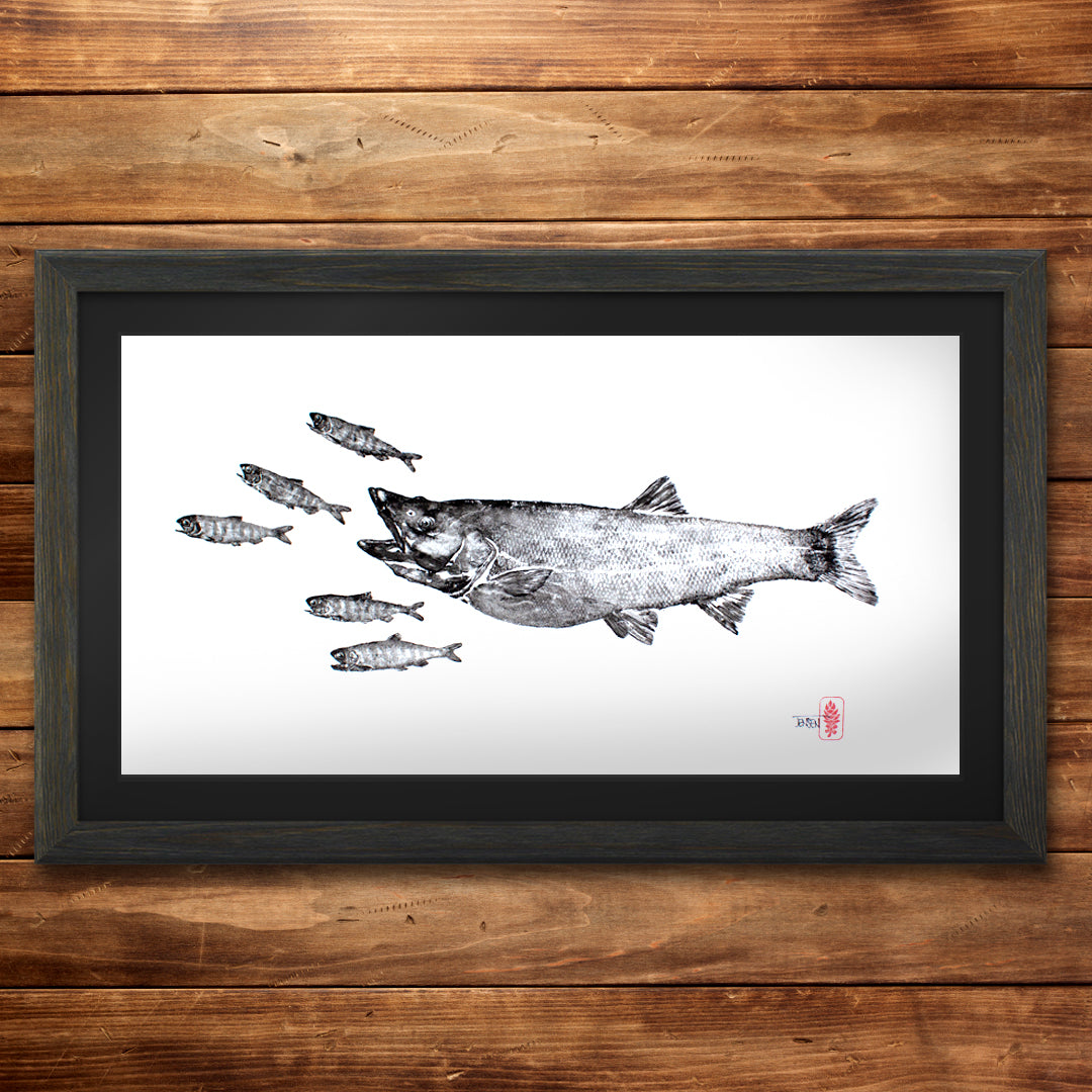 Original rice handmade fibre and sumi ink printed directly off the fish. Colored originals were painted on high resolution scans so as not to damage this genuine piece of art. Hand signed and stamped with numbered (1 of 1) Certificate of Authenticity. Framed by Italian pine under 100% UV protected acrylic glass, matted and mounted with acid free materials.